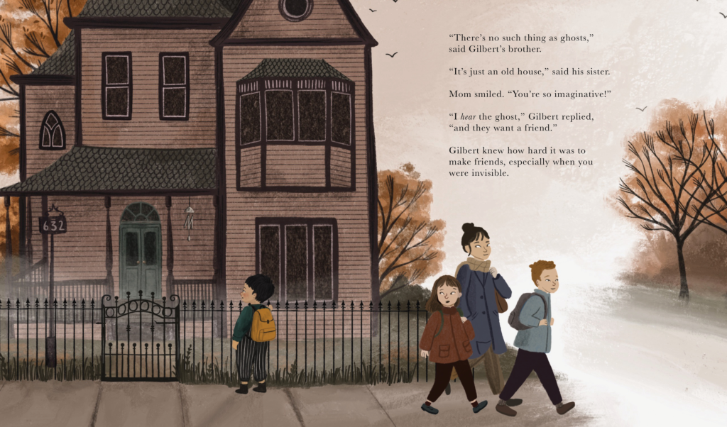 Aren’t Jess’s illustrations perfect? Just right for a mysterious, ghostly, friendship story! I included only a few art notes in my manuscript. Two were to indicate what Gilbert’s notes say. When Beaming shared the digital ARC with me the first time, I pointed out one inconsistency (I think a windchime that was shown hanging from the house’s front porch was missing in one or two spreads). When they shared the digital version for final review, I noticed something missing on the spread where there was a line of text that read, “No one at the playground noticed when Gilbert left the kickball game.” In the first set of pages I received, the children in the art were playing with a ball, but in the final ARC, there was no ball! I knew children would notice that, so I asked if they could either put a ball back in or alter the text (and I proposed a revision to that line). They decided to change the words, and now it fits perfectly with the art.