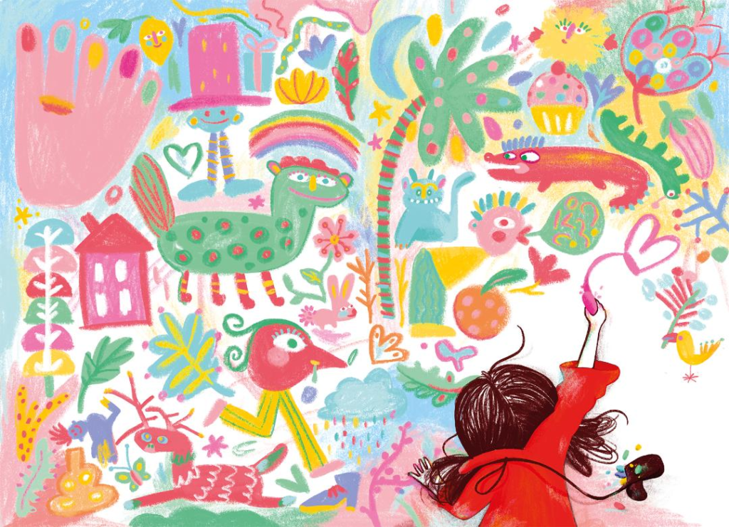 A. I don’t think I can ever really know the answer to that question. The immediate spark was a sign I saw at a children’s carousel forbidding children below a certain height to go on the ride. I was inspired by many other young female characters such as Madeline and Alice. I was influenced by my childhood growing up as a Jewish, left-handed child in a small city in Canada which had low tolerance for either characteristic. And by a 1946 Disney cartoon (All the Cats Join in) in which the illustrator’s pencil and eraser are part of the storyline.